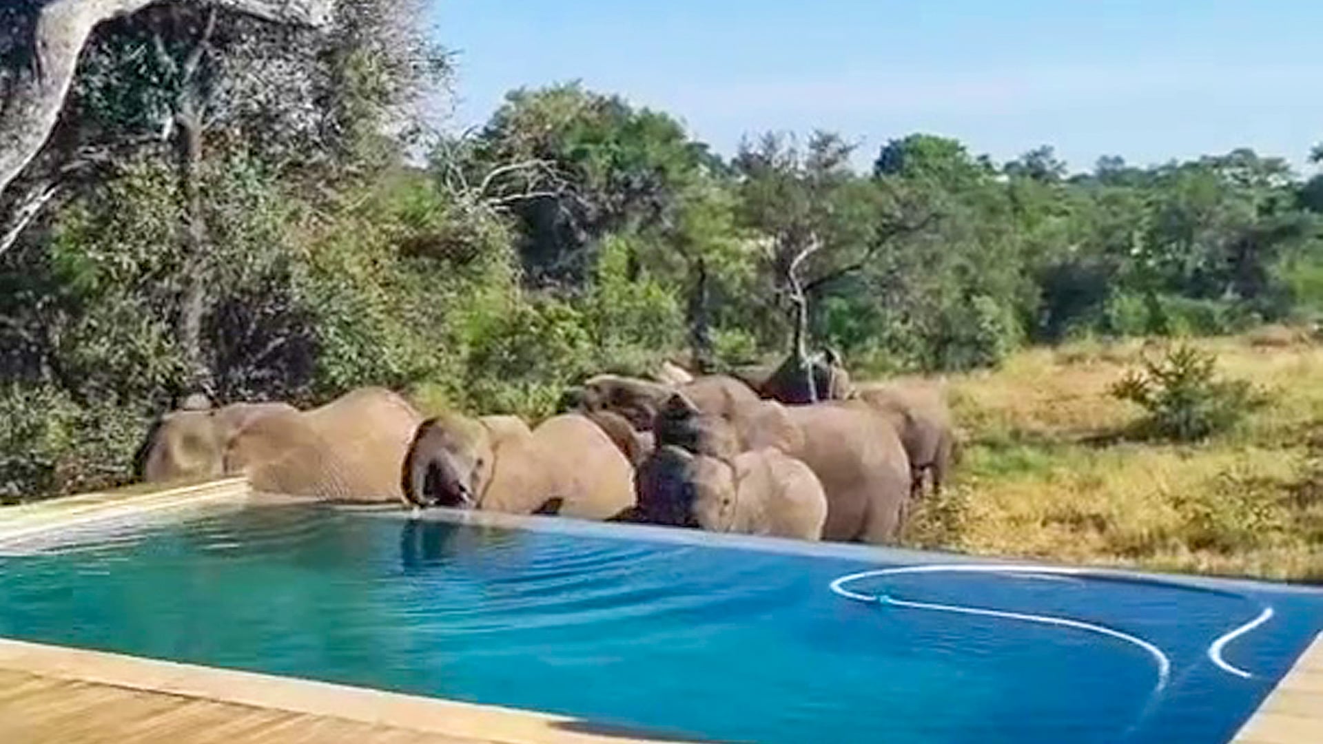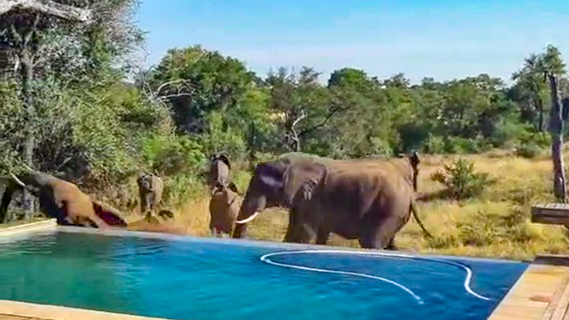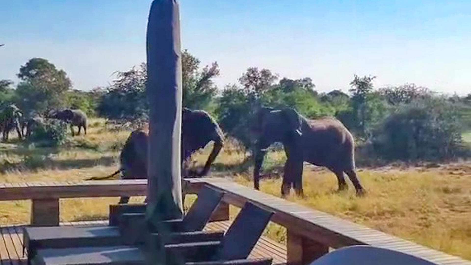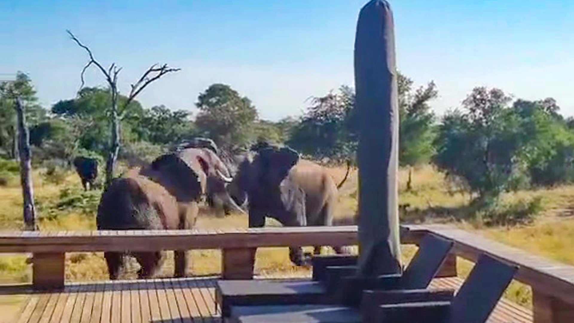 A calm moment at a safari lodge quickly turned into a dramatic display of power when two bull elephants began fighting just outside the property.