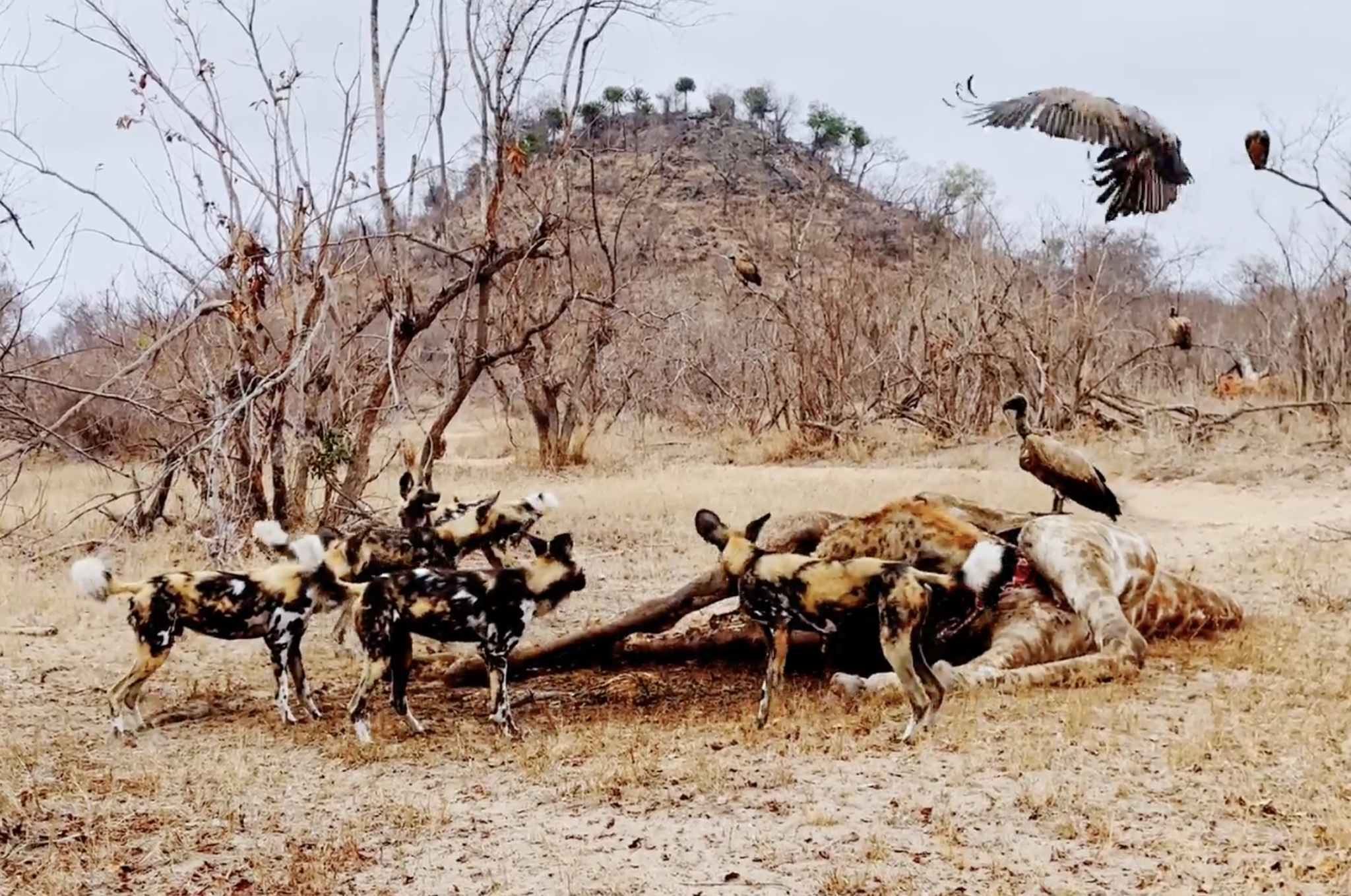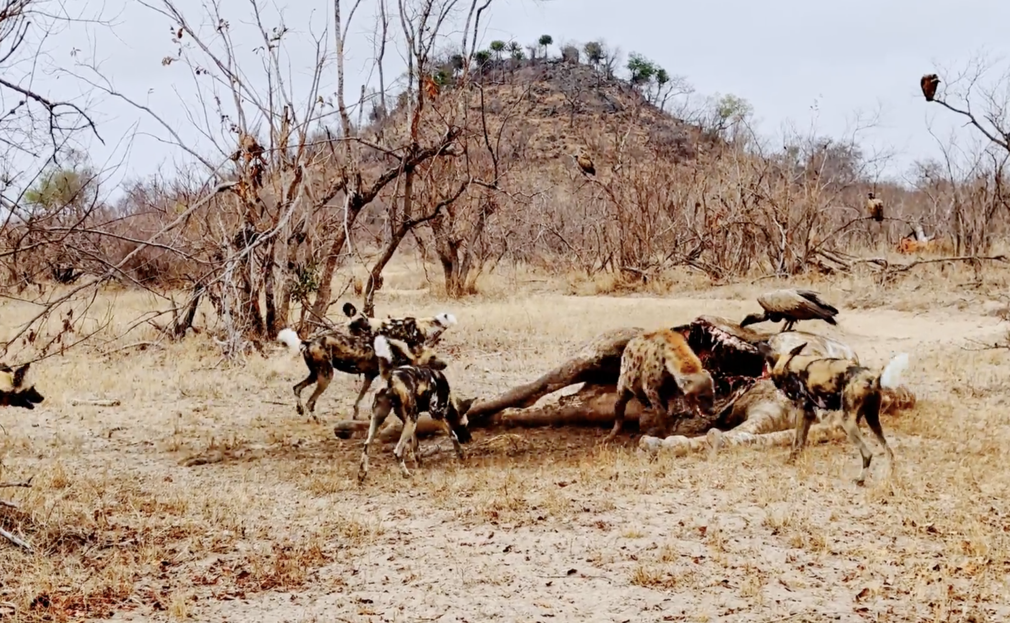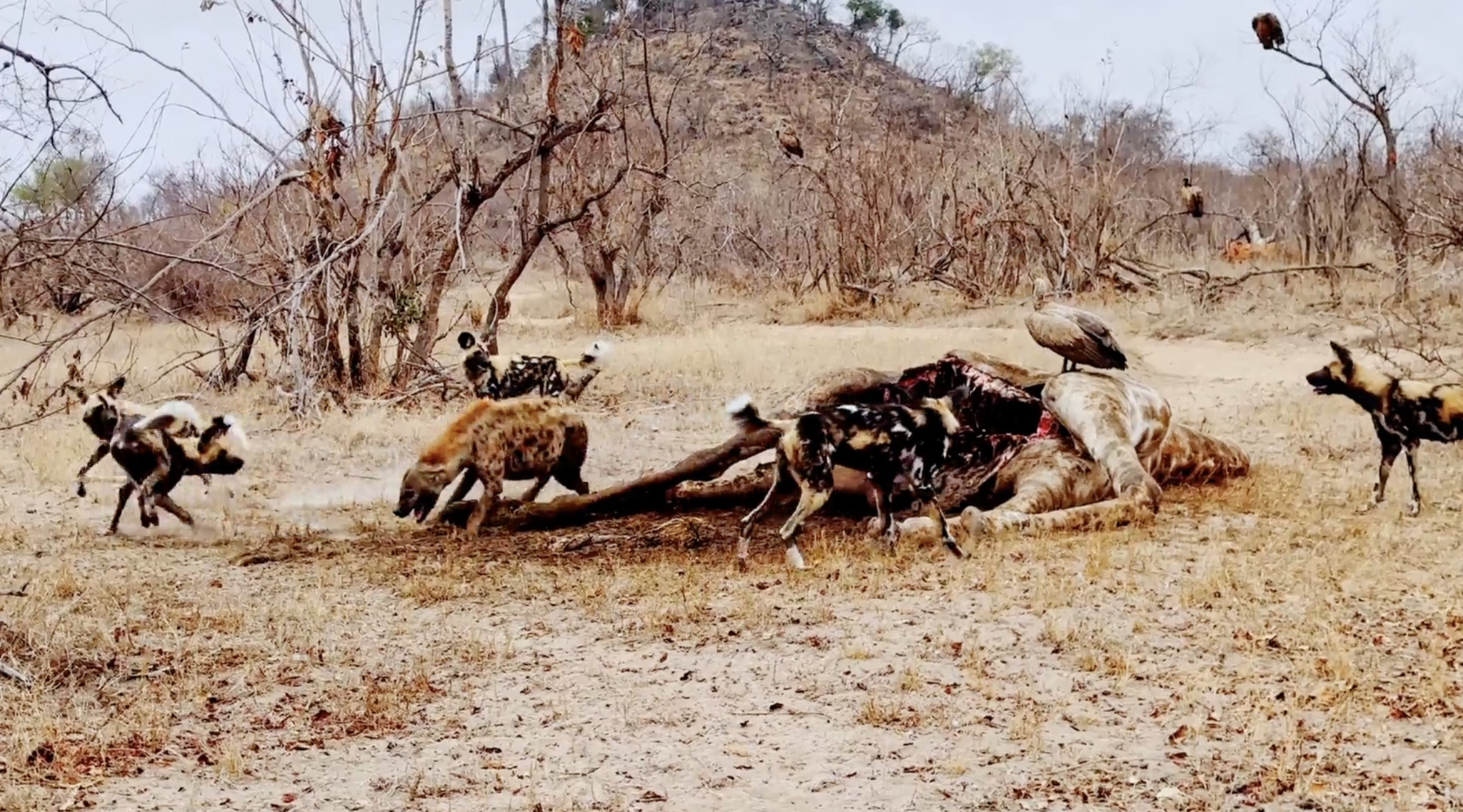 But the situation escalated quickly when a pack of wild dogs arrived. Known for their teamwork and persistence, the dogs began circling the carcass, challenging the hyenas. What followed was pure chaos—animals darting in every direction, vultures flapping wildly, and predators clashing over scraps.