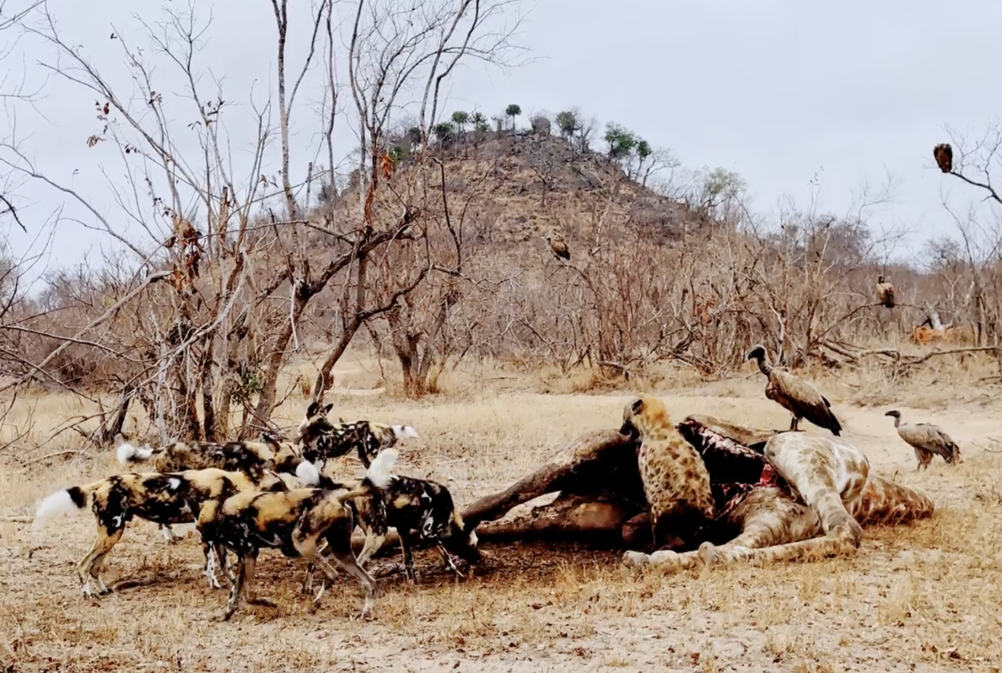 The wild dogs hesitated, confused and unwilling to follow into such a gruesome hiding place. For a moment, the hyena had found safety in the most unexpected way. Soon, other hyenas returned, the vultures regrouped, and the chaotic feeding resumed as if nothing had happened.