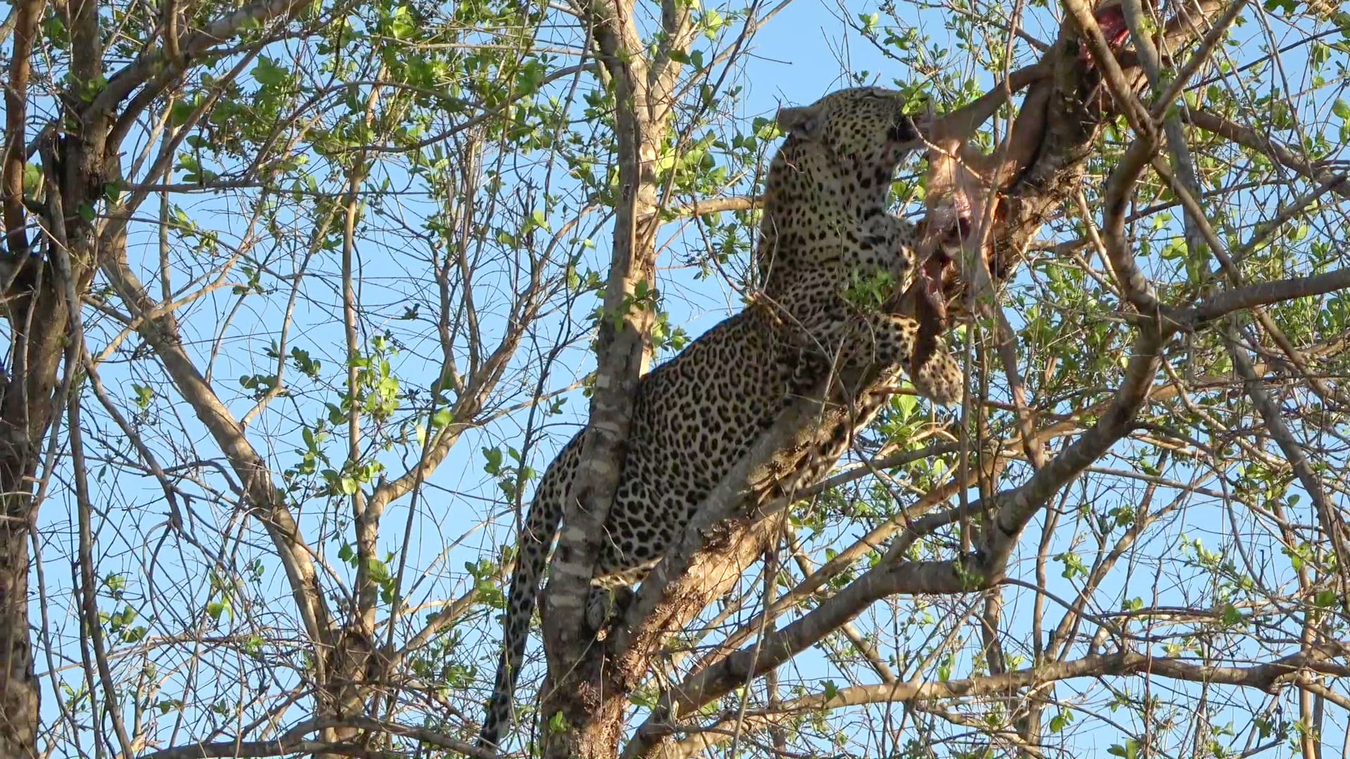 One of the leopards sat perched up in the branches of a tree, and was methodically picking away at the carcass. It was showcasing the classic leopard strategy of protecting meals from ground scavengers.