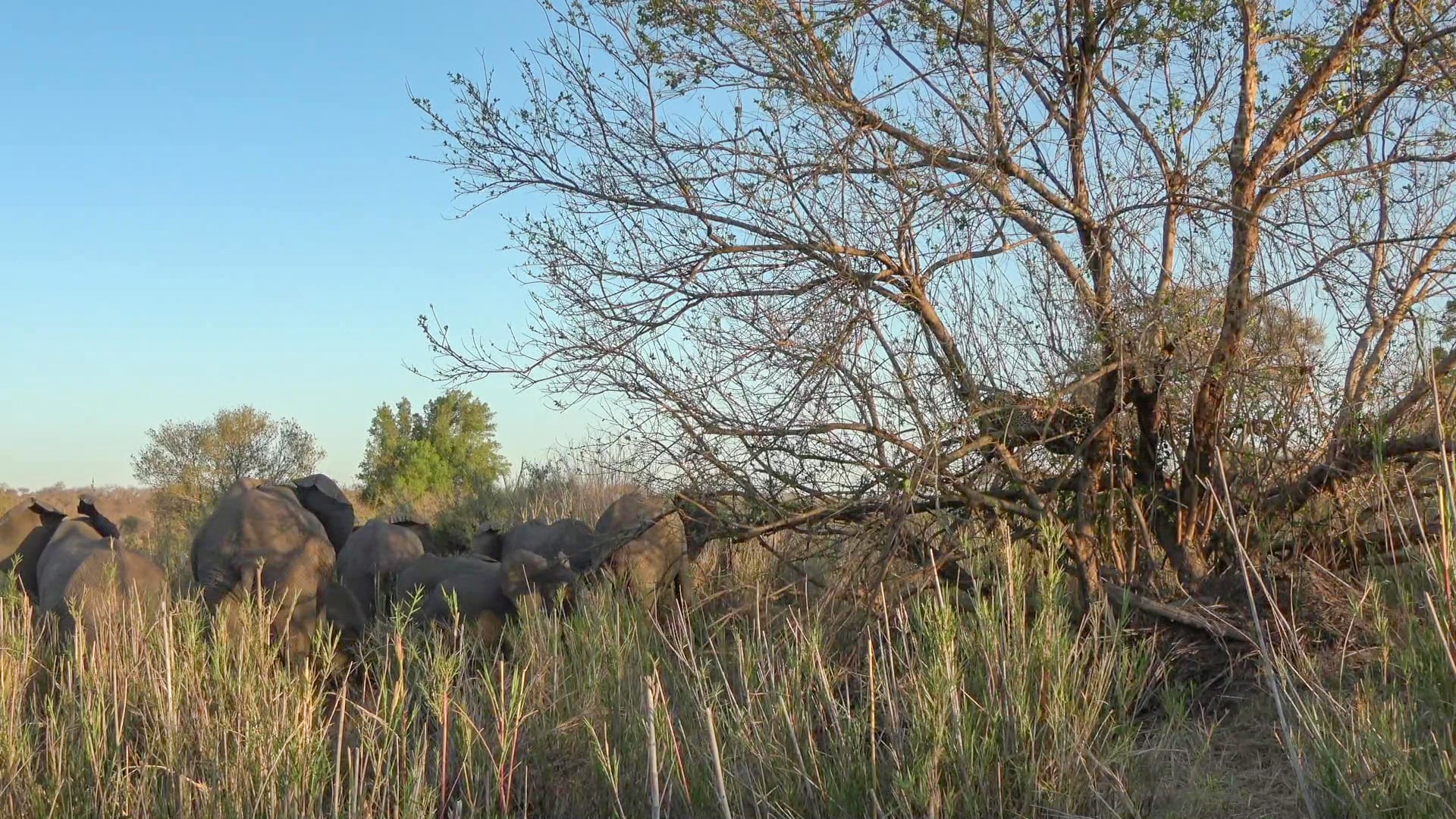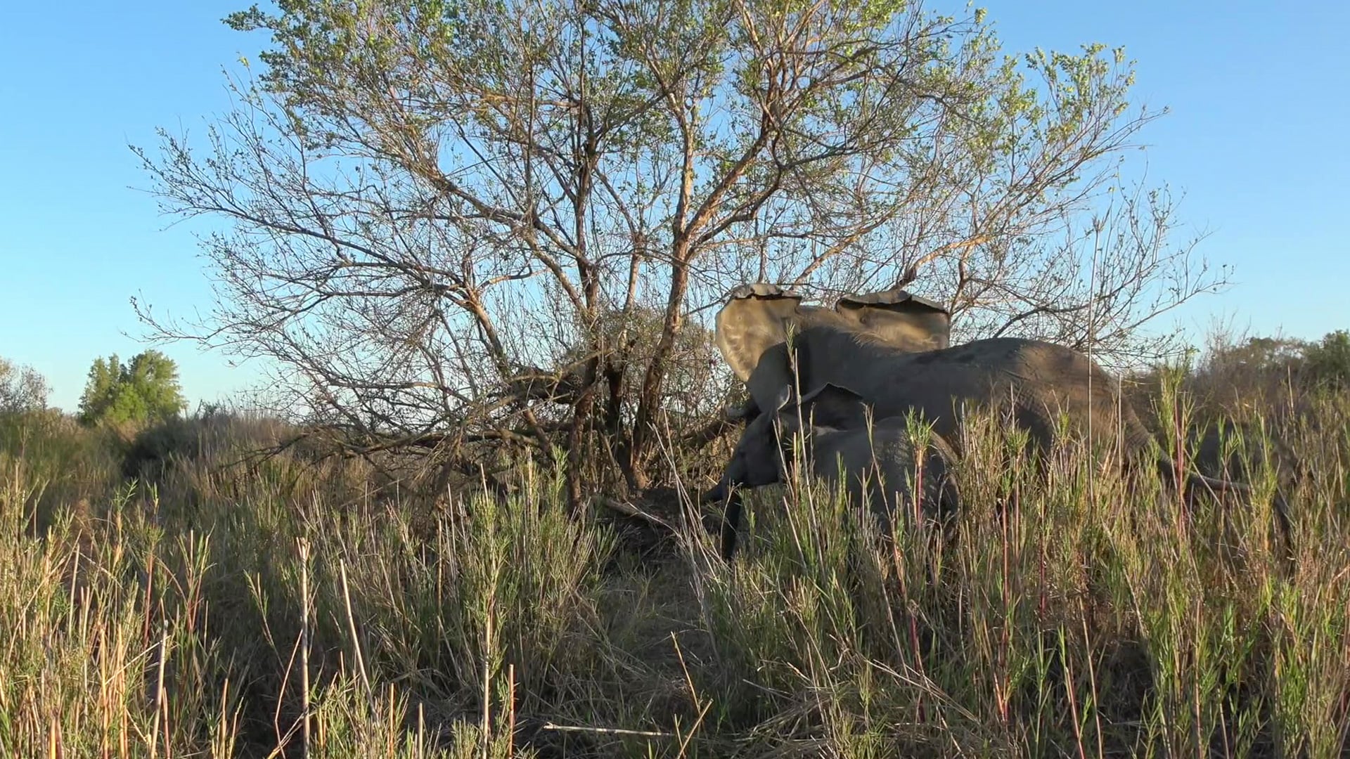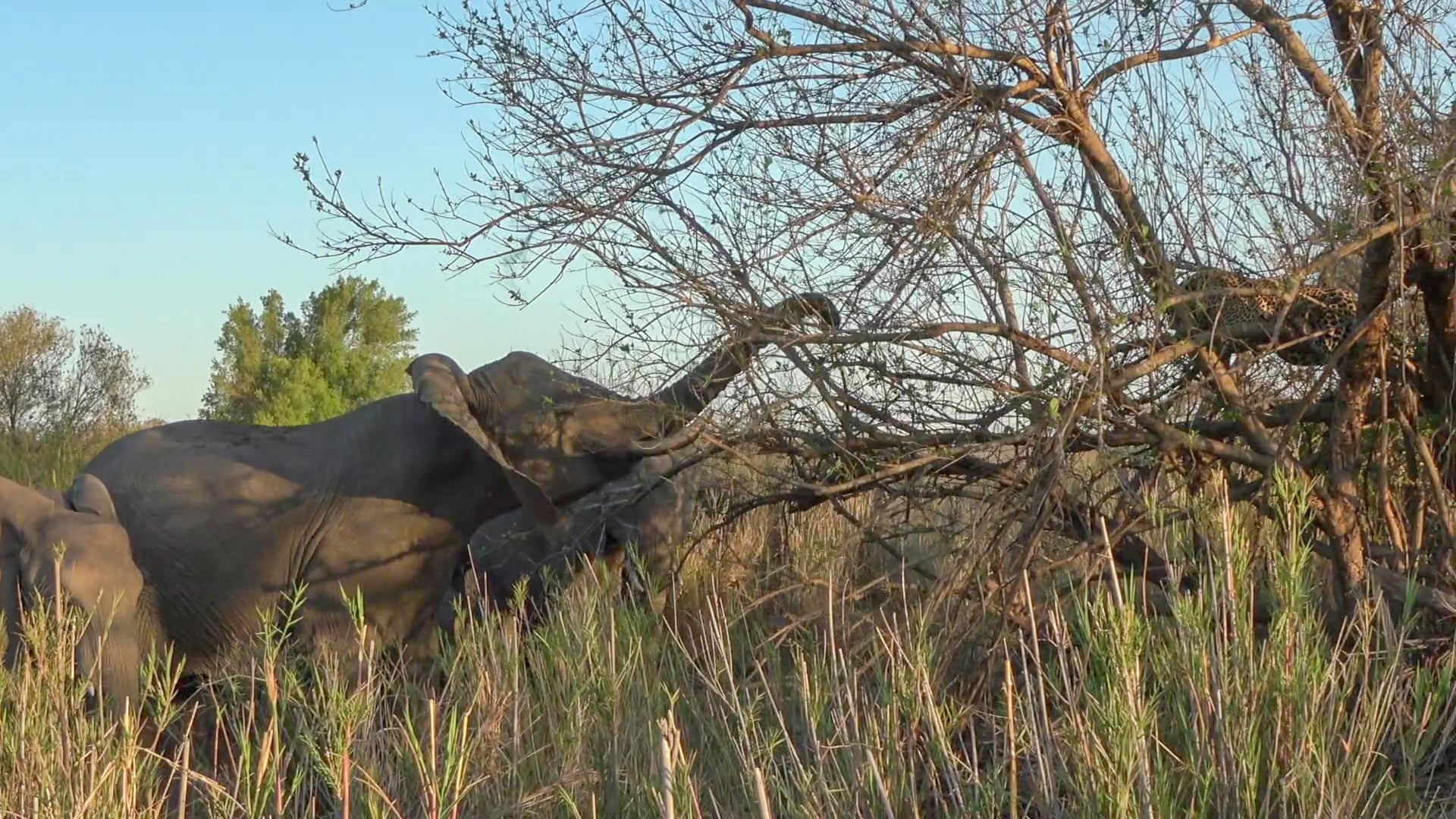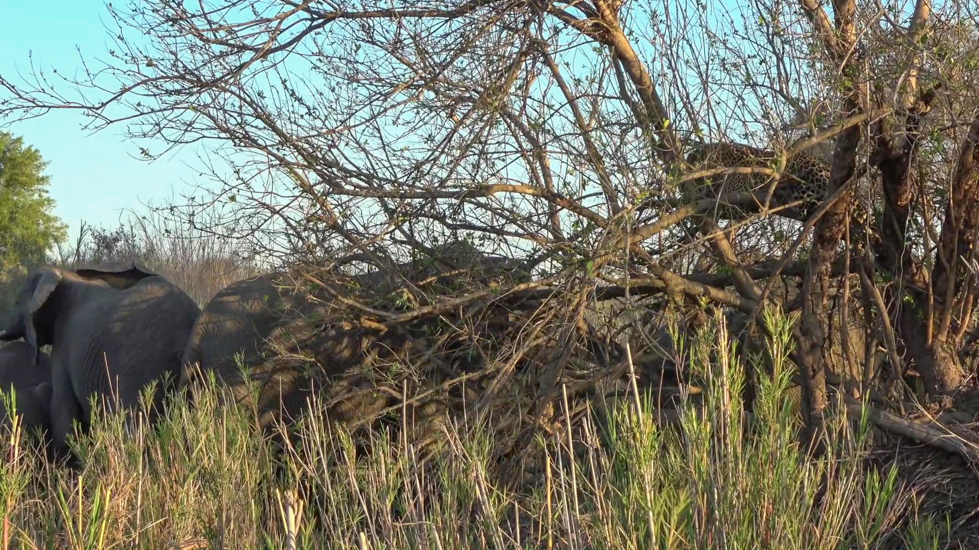 Even on a perfect blue-sky day, drama in the bush never hits pause. Two leopards had recently secured a kill and were just starting to enjoy the spoils when some elephants had something to say about it.