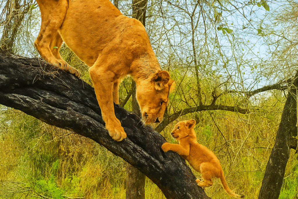 At first, the young cubs appeared unsure of how to respond. They circled the base of the tree, looking up and letting out playful calls of their own. Some attempted to climb a fallen branch, thinking it was more suited to their size, but the mother’s persistent calls made it clear she wanted them to attempt the real tree. Despite lions not being known for climbing like leopards, this mother seemed determined to pass on a rare and useful skill.