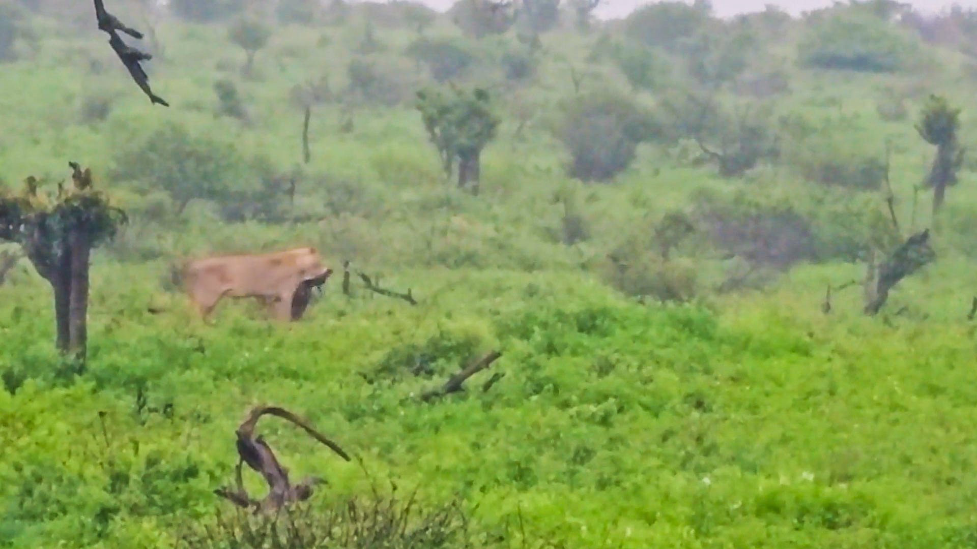 Carrying the calf in her jaws, the lioness retreated into the bush, leaving the rest of the wildebeest herd to watch helplessly from a distance. For her, the kill meant nourishment and survival, while for onlookers, it was a dramatic glimpse into the raw reality of life on the African savanna. As the bushveld settled back into silence, the lioness prepared to feast in seclusion, away from scavengers and competitors.