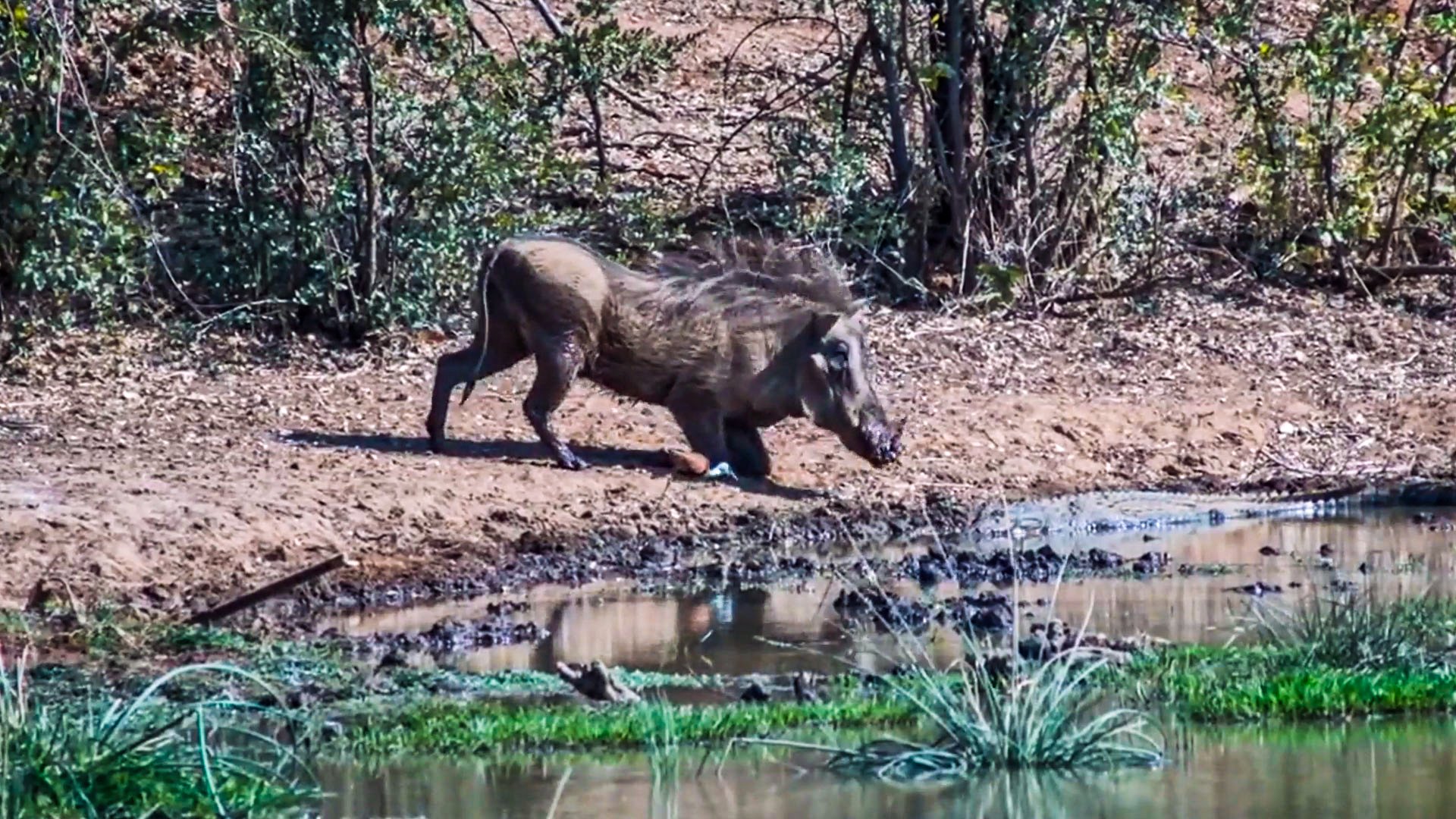 The warthog circled the area, snuffling along a trail that led it straight to the crocodile. Rather than fleeing, it began to taunt the reptile by tossing wet mud with its snout and tusks. The crocodile remained still, watching silently as the hog crept closer, seemingly daring it to react.