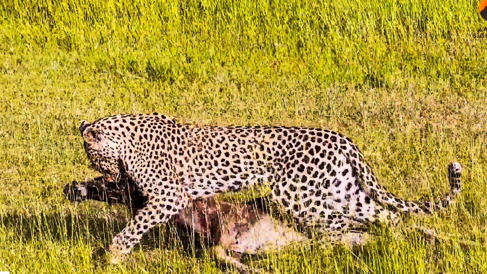In Botswana’s Okavango Delta, a dramatic struggle unfolded when a leopard targeted a wildebeest calf within a large herd. While adult wildebeest are strong and dangerous prey for a lone leopard, the presence of a vulnerable calf offered the predator a chance. Leopards rely on stealth and patience, and this one used the long grass to stalk its target, waiting for the perfect moment to strike.