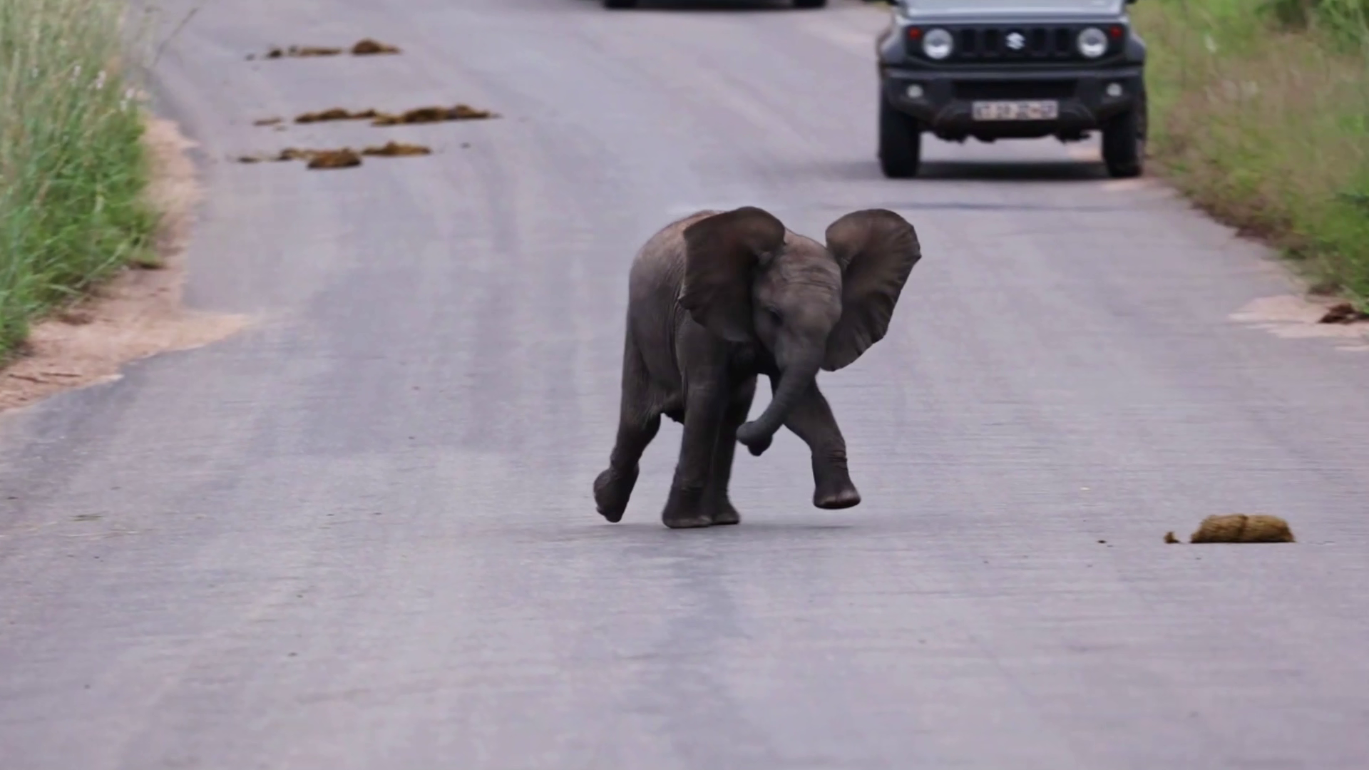 As Zander’s video begins, we are met with a sight that is meant to intimidate us… Lol. A young elephant bull stands with his head raised and ears flared, daring the oncoming traffic to proceed. Little does he realise the cars have stopped to watch his antics.