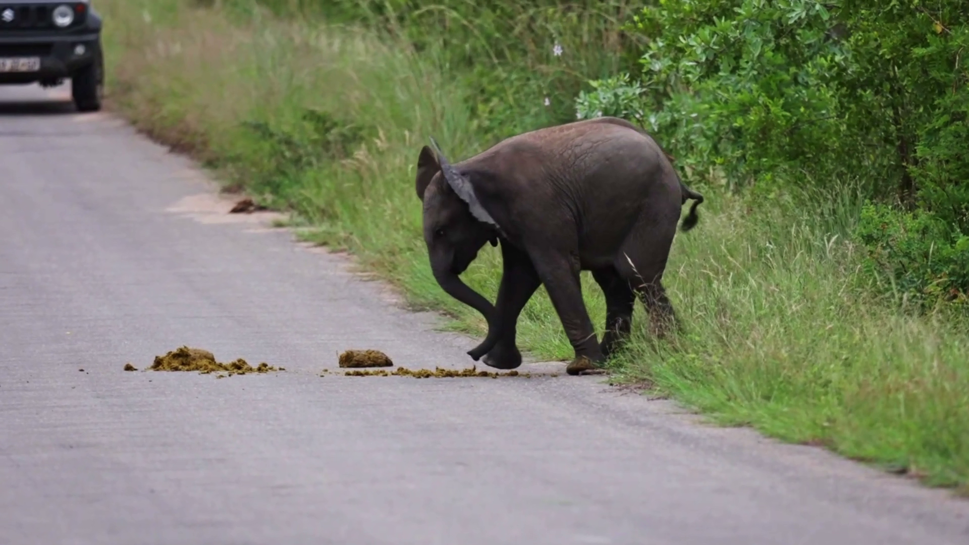 Subsequently, the calf flares his ears, lowers his head, and charges the mighty pile of poop. As he barrels into it, he kicks it, sending a splatter of dung flying across the road.
