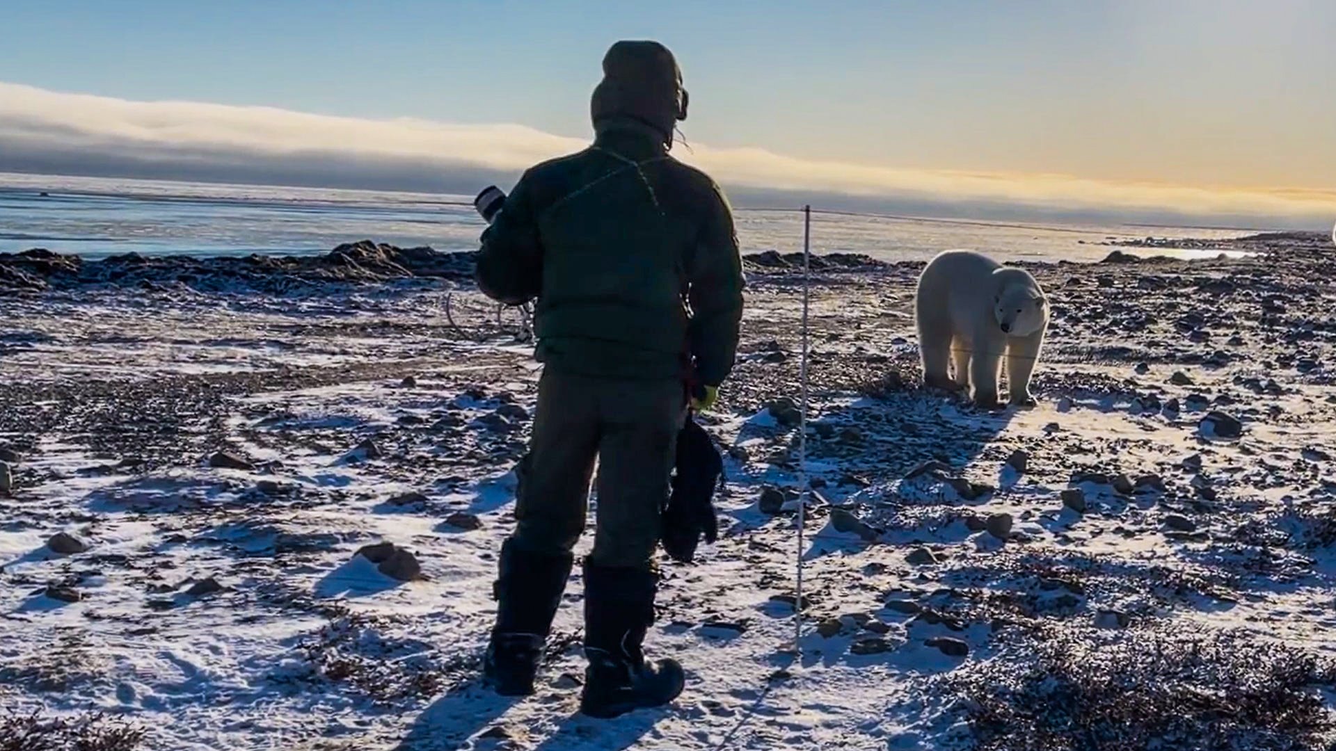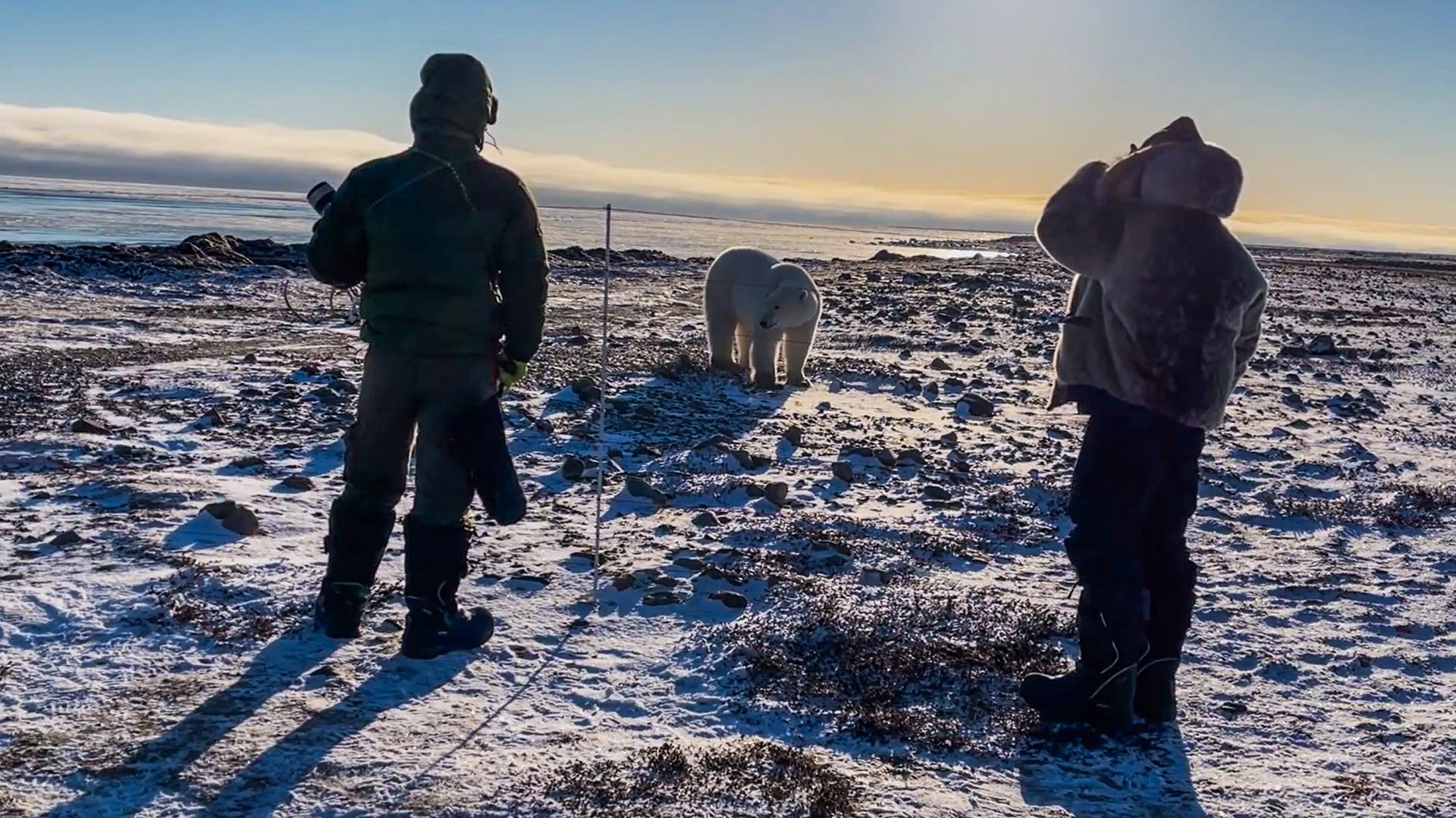The video opens with a tense moment: two men face off with a polar bear. Between them and the bear is a barrier with multiple strands — likely electrified — offering some measure of protection.