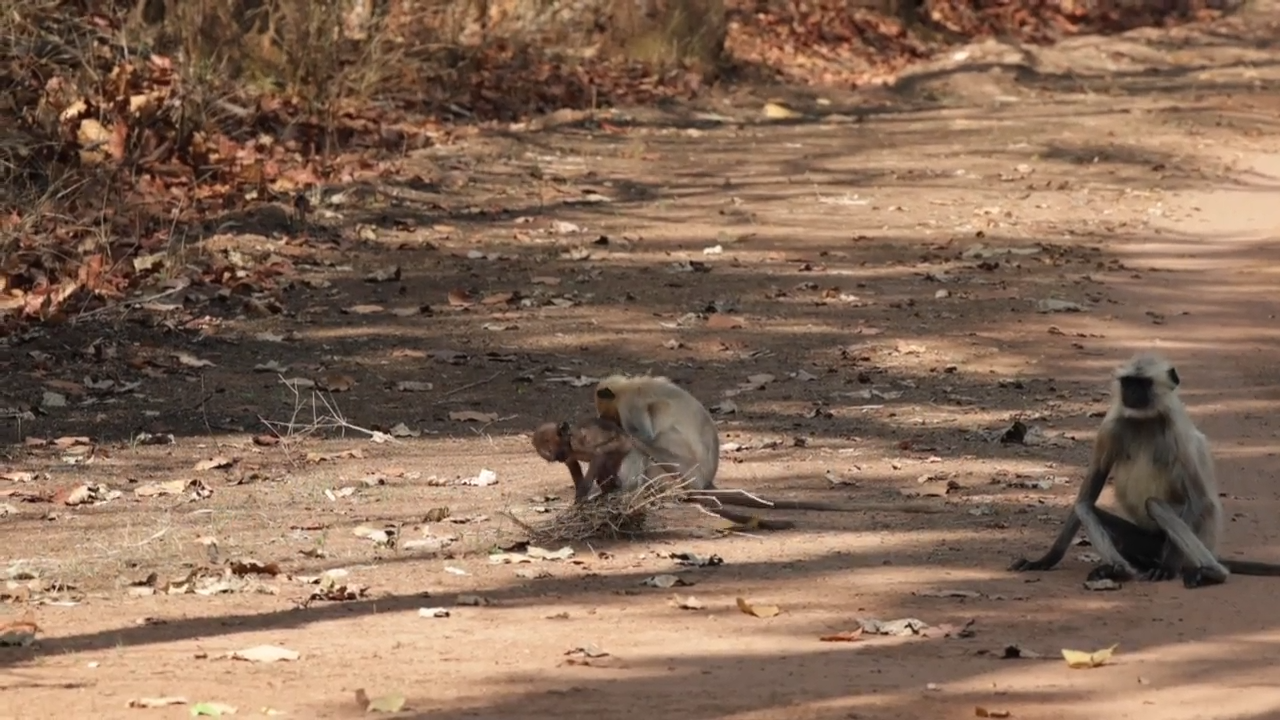 The broom that had caught so much of its attention was lying on the ground, potentially discarded, but it must have been a slow day for the langurs, as several of them had taken an interest in it. As the smallest ones present, the baby monkeys apparently had to learn their place in the hierarchy, and one of the older monkeys pushed the baby down to the ground so it didn’t interrupt their investigation of the broom.