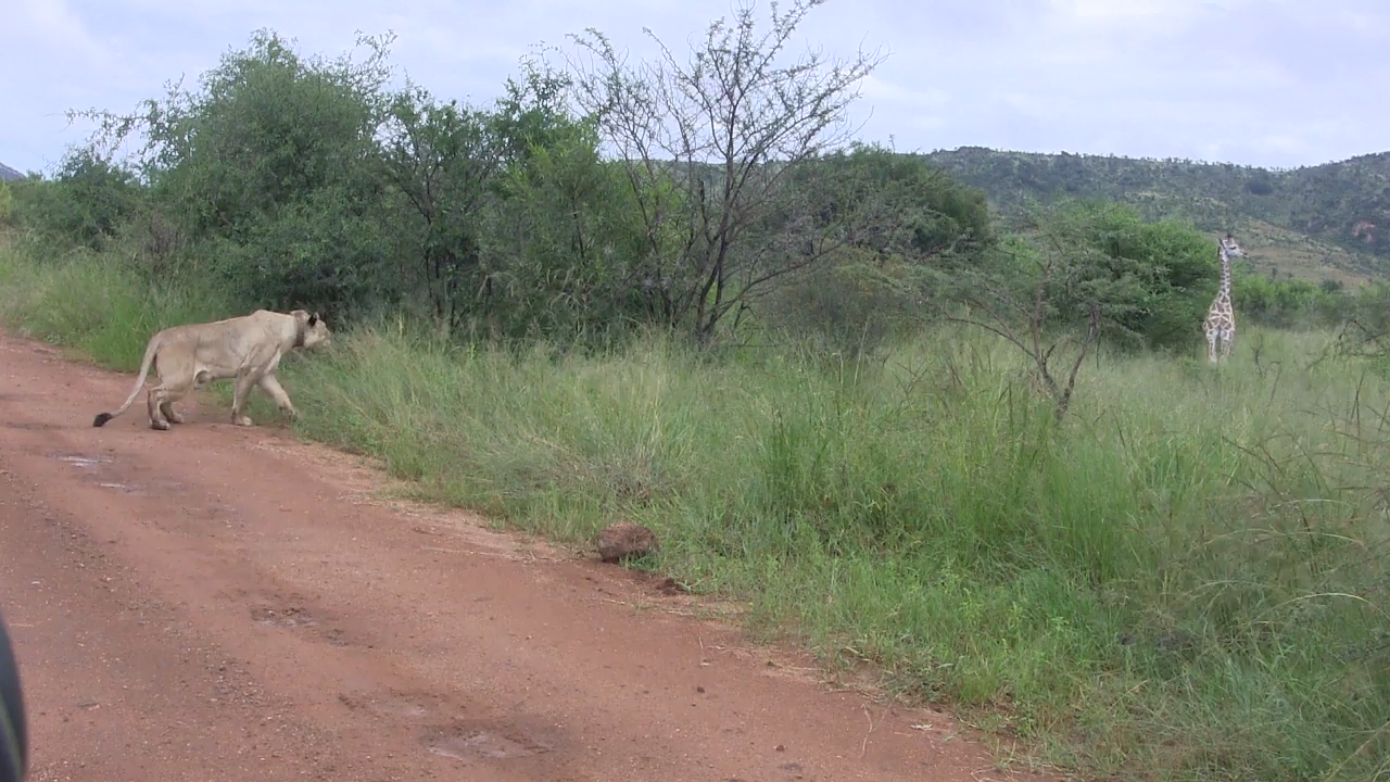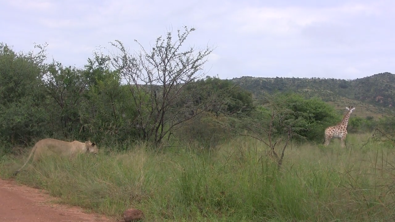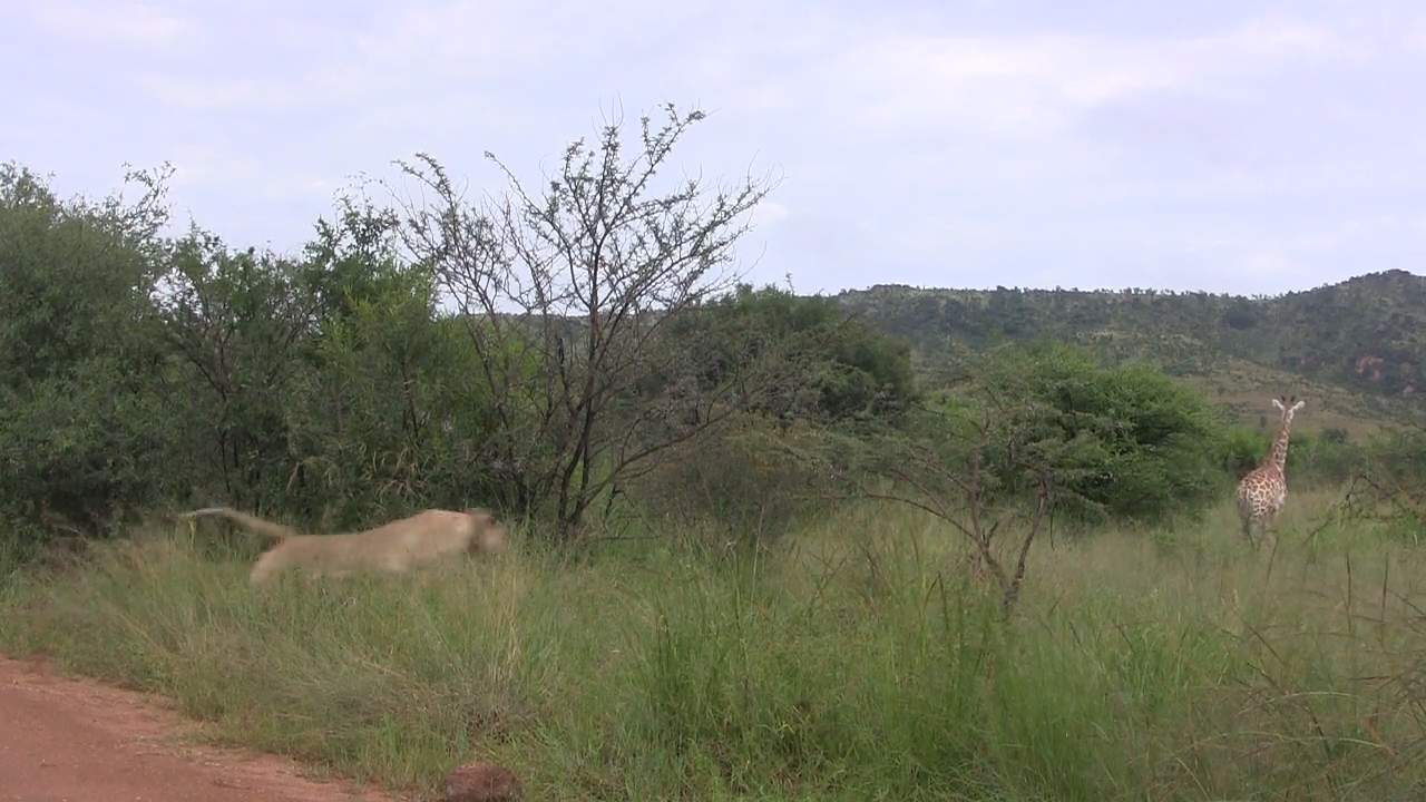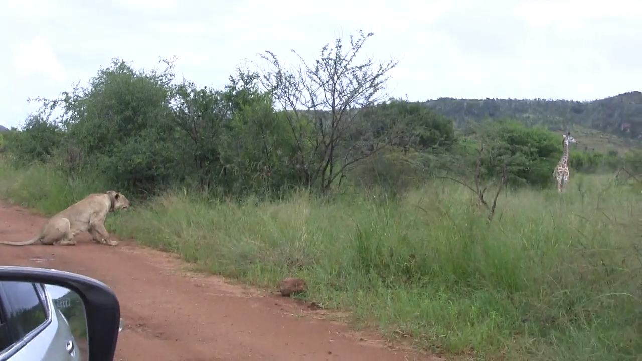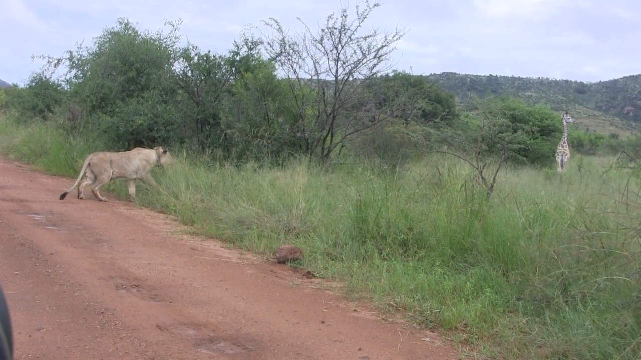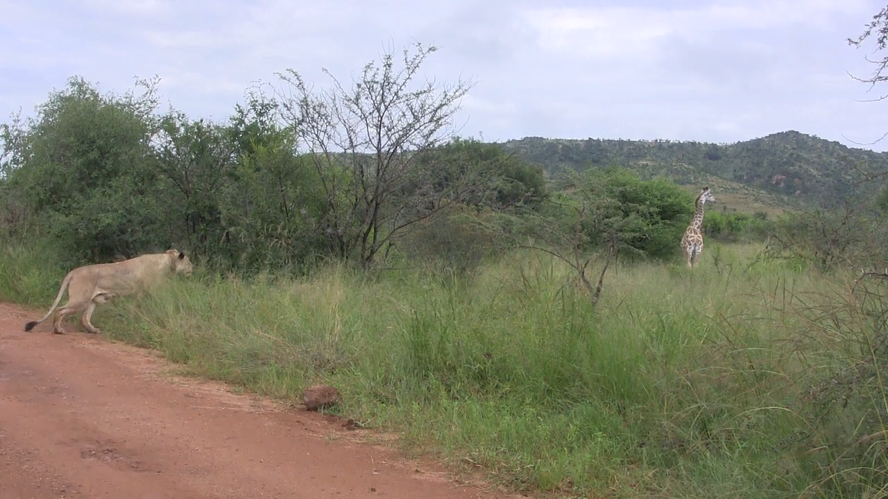 As the big cat crept through the long grass, the giraffe finally turned its back and began walking away in an attempt to maintain the distance between them, but already that distance was short enough that the lion felt confident it could bring the giraffe down. Accelerating rapidly, the lion burst out of the long grass as the giraffe finally tried to start running, but it had left it too late. As the pair disappeared into the bush at the side of the road, the lion was quickly closing the short gap between them.